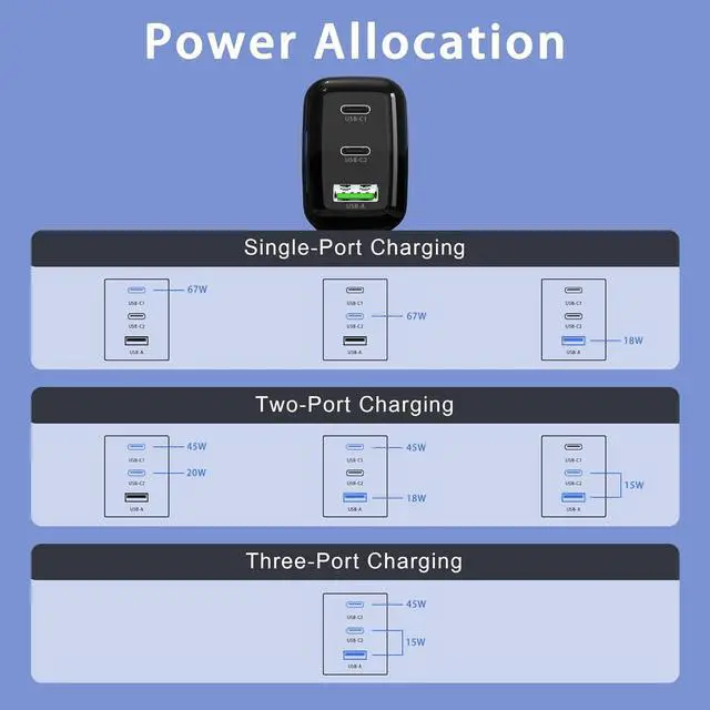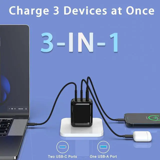 3-Port: Equipped with two USB-C ports and one USB-A port to power three devices at the same time.