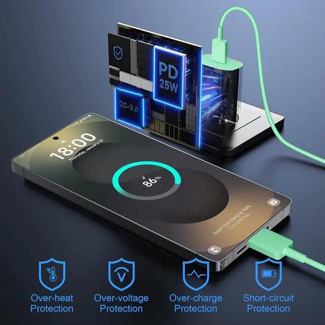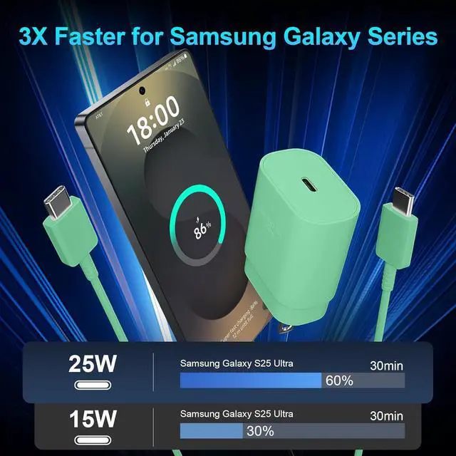 Small & Powerful: With 25W charging power but smaller size, this Samsung charger fast charging cord is more convenient and portable. Equipped with a type c port, you can charge your device back to full power in no time by using the 25W USB C fast charger for Samsung Galaxy S25 series. It only takes 30min to charge your Samsung Galaxy S25/S24/S23 ultra from 0 to 60%, 5 times as fast as standard USB C charger.