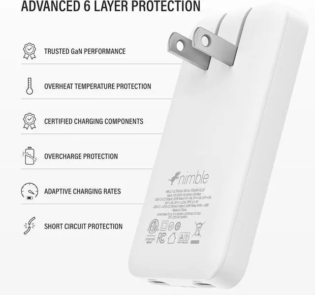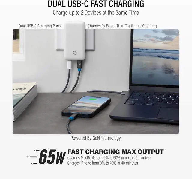 Fast Charging: This 65W GaN slim wall charger is 3× faster than standard chargers. Delivers up to 65W when using a single portcharge iPhone or MacBook to 70% in just 40 mins. Ideal for fast, efficient charging of laptops, phones, tablets, and iPads.