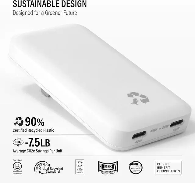 Sustainable Design: Made from certified recycled plastic, this flat charger block cuts CO2 emissions by 9.1 lbs. It comes in 100% biodegradable, plastic-free packaginga sustainable choice for the planet and perfect for powering your devices.