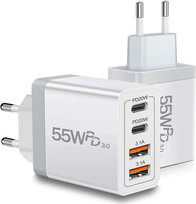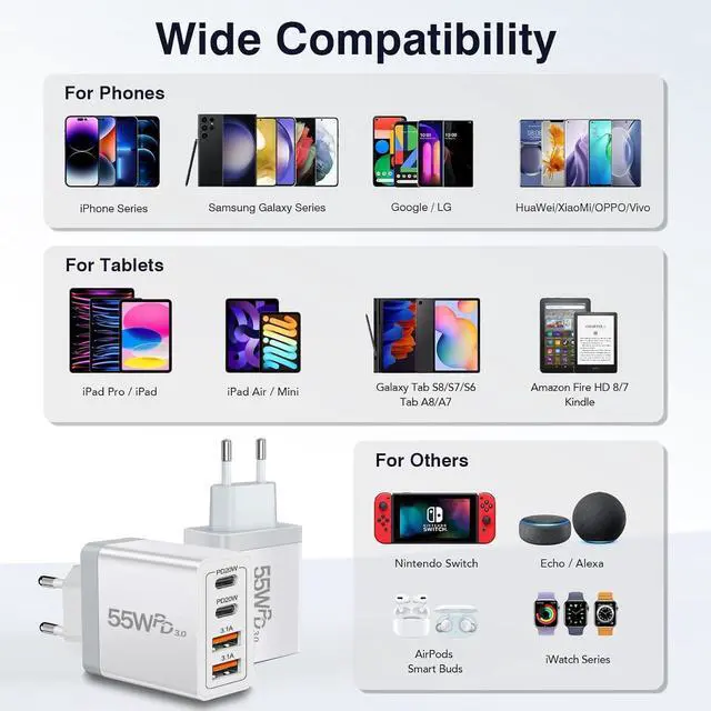 Pack: European travel essentials-55W USB C Fast Charger, this travel-friendly charger supports fast charging functions Power Delivery and Quick Charge 3.0, with a total output of up to 55W. The USB A port provides 5V/ 3.1A output power, while the USB-C interface provides a charging speed of 20W, which can charge your iPhone 15 from 0% to 60% in just 30 minutes, 3 times faster than the original wall charger.