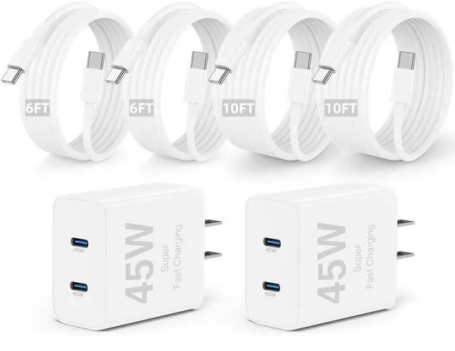 will get: dural port PD 45W fast charging wall charger block cube and 2pack long usb c to usb c cable cord 6ft/2M and 2pack long usb c to usb c cable cord 10ft/3M. And all charger block and cables you purchase enjoy customer service. If you encounter problems during use, please find us through in time!