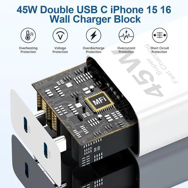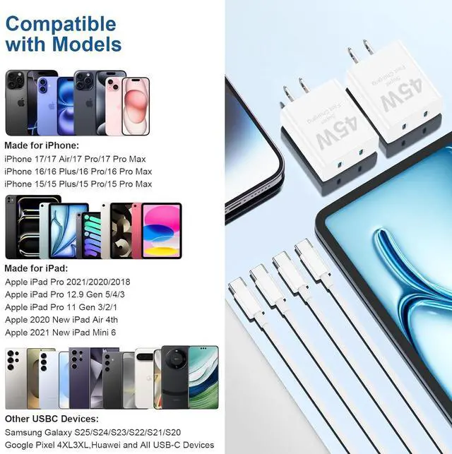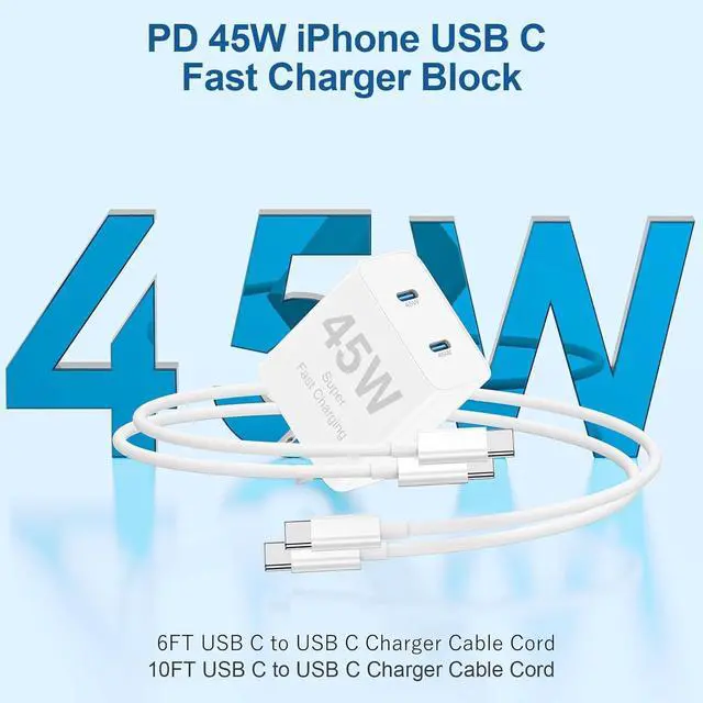 PD 45W USB C Fast Charger BlockThis 45w dural port usb c fast charger block with usb c to usb c charging cable cord charges your iPhone 17 Pro Max/17 Air/16 Pro/16 Pro Max/15/15 Plus series up to 60% power in 30 minutes and charges iPad Pro 12.9 /11 inch/iPad Air 5/4/iPad mini 6 up to 70% power in 50 minutes, which saves more than 1 hour for you, when compared to the 20W original charger.