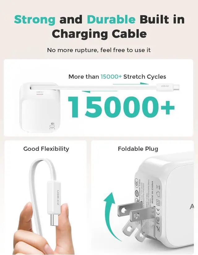 30w Fast Charger for 2 DevicesThe retractable iphone charger with wall plug has USB C output and a retractable usb c cable, which can charge 2 devices at the same time. Whether it is powering an iphone, an Android phone, or tablets, it can provide up to 30W max fast charging capability in total, stable and efficient