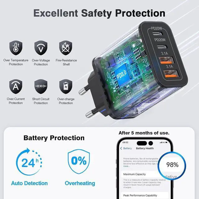 Pack: European travel essentials-55W USB C Fast Charger, this travel-friendly charger supports fast charging functions Power Delivery and Quick Charge 3.0, with a total output of up to 55W. The USB A port provides 5V/ 3.1A output power, while the USB-C interface provides a charging speed of 20W, which can charge your iPhone 15 from 0% to 60% in just 30 minutes, 3 times faster than the original wall charger.