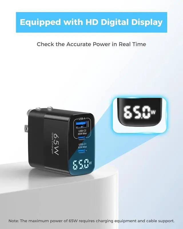 Wide compatibilityOur 65W PD charger features broad compatibility, supporting a comprehensive range of fast-charging protocols including PD 3.0, QC 4+, and widely-used ones like PPS, SCP, FCP, AFC, and PE+. A versatile charger that is a Digital Display, Foldable, and Lightweight Charger all in one. One charger is enough for travel, home, and work.