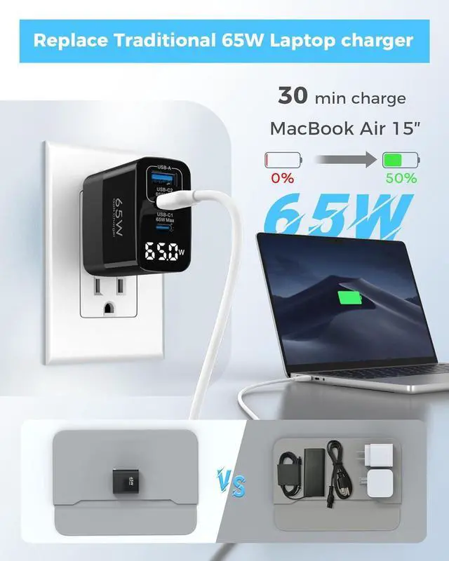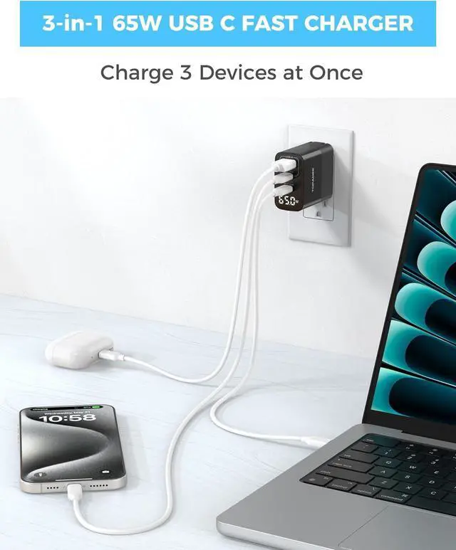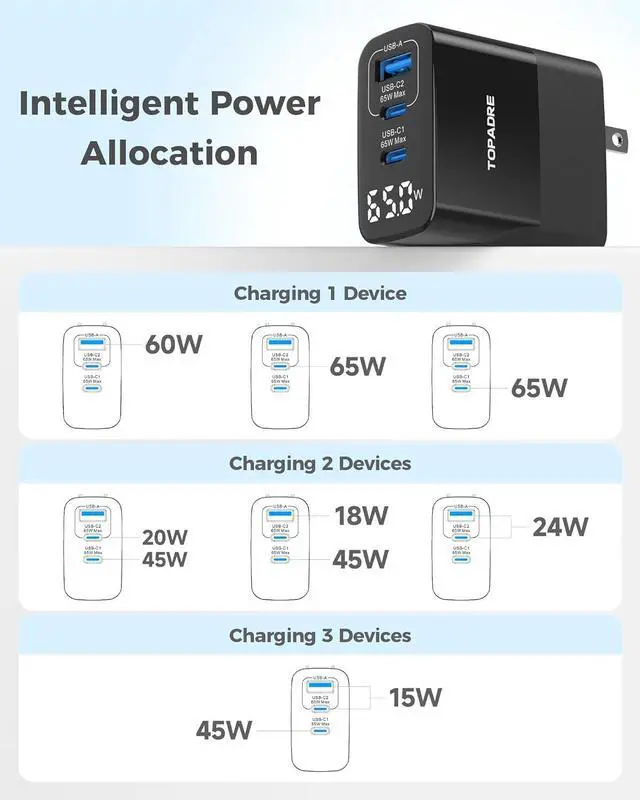 3-in-1 65W ChargerTOPADRE is a professional manufacturer specializing in charger production. This 65W GaN Fast Charger block adopts Power Delivery (PD) & Quick Charge (QC) technologies, which can charge the MacBook Air M2 to 50% in 30 minutes. Features 2 USB-C ports (65W Max) and 1 USB-A port (60W Max), which supports 3 devices to charge at the same time. Eliminate cable clutter! This wall charger is all you need for home, office, and travel to keep all your essential devices powered.