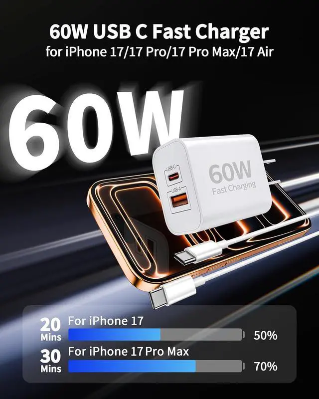 Series: The USB C charger adopts the 2025 all-newly upgraded PD 3.0 fast charging technology and supports a maximum power output of 60W. Utilize either USB-C port to charge your iPhone 17 up to 50% in just 20 minutes. Enjoy 60Watt fast and efficient charging at home, in the office, travel, or on the go
