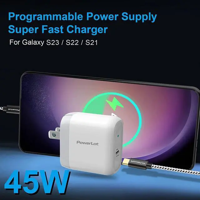 45W Super Fast ChargerPowerLot 45w usb-c charger could fast charging MacBook Air 13' ' within 2 hours; Programmable Power Supply (PPS) 45W super fast charger for Galaxy S23 ultra, S22 Ultra, S22 Plus, S22, S21, S21 ultra, Z flip 5, Z fold 5, always provide enough juice for your devices