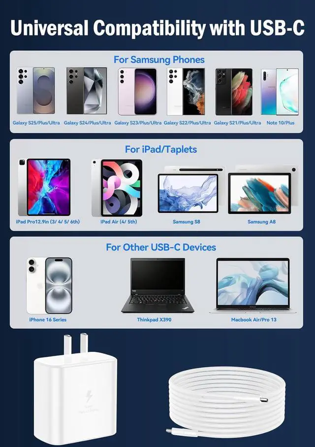 Universal Compatibility with Latest Samsung & Apple Models: Works seamlessly with all USB-C devices, and is optimized for the newest flagship phones, perfect to super fast charge Samsung Galaxy S25 Ultra/Galaxy S24 Ultra/S24+/S24/S23 Ultra/ S23+/S23/S22 Ultra/ S22+/S22/S21 5G, S21+ 5G. It also compatible with iPhone 17/16/17 Series, iPads, Apple Watch, AirPods and more