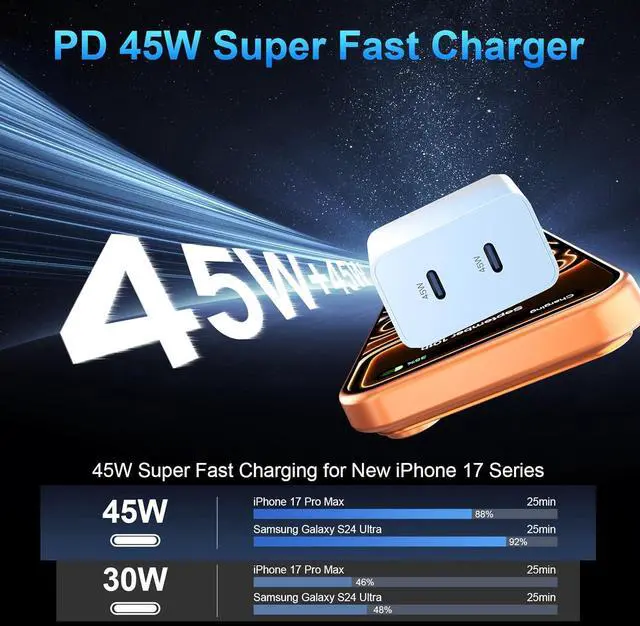 Pro Max: 45W type c super fast charger supports multiple fast charging technologies, including i-Phone 17 Pro Max/ i-Phone 17 Pro/ i-Phone 17/ i-Phone 17 Air/i-Phone 16 Pro Max/ i-Phone 16 Pro/ i-Phone 16/ i-Phone 16 Plus/ i-Phone 15/15 Plus/15 Pro/15 Pro Max, Pad Pro 11 inch 4th/ 3rd/ 2nd/ 1st, i-Pad Air 5/4th, Pad Mini 6th, i-Pad 10th Generation, also compatible with Samsung Galaxy S24 Ultra/S24+/S24/S23 Ultra/ S23+/S23/S22 Ultra/ S22+/S22/S21 5G, S21+ 5G, and other Android devices