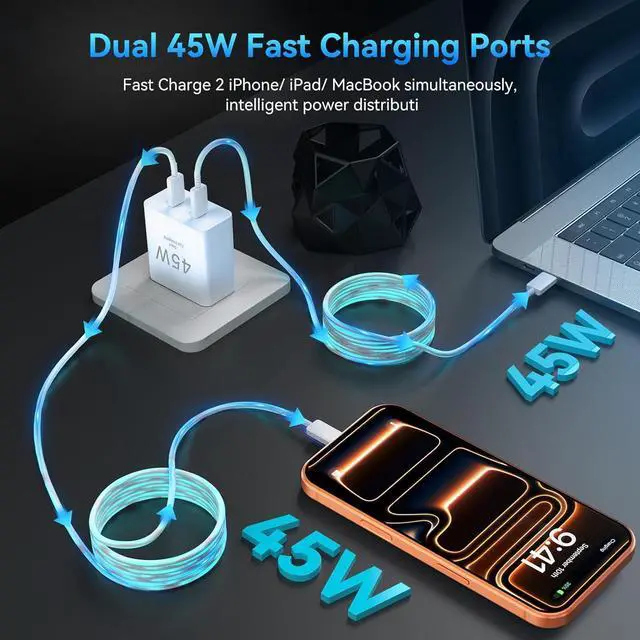Pro Max Charger Fast Charging: With two independent output ports, the 45W USB C charger block supports charging your USB C device like i-Phone 17 16 15 and i-Pad simultaneously, powering your i-Phone 17 Pro Max up to 70% in just 30 minutes, 8X faster than the original 20W USB C charger