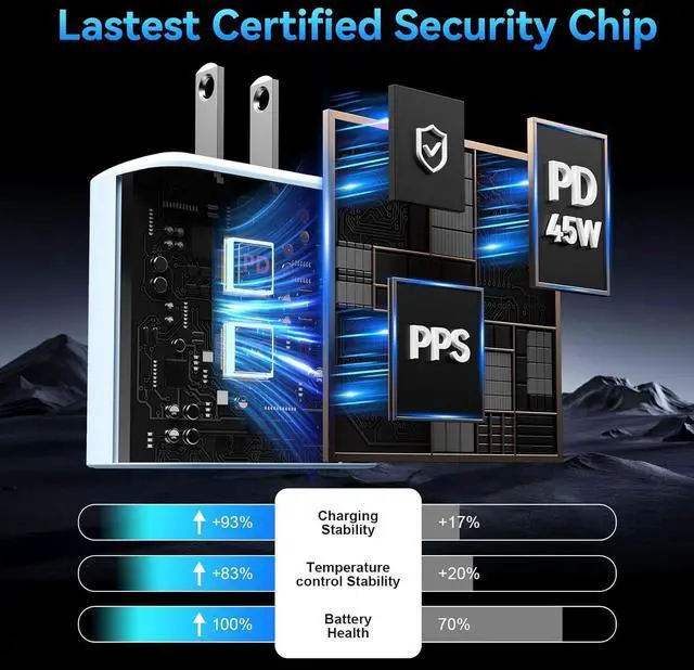 Integrated GaN technology--Safe & Reliable: Our USB C charging block prioritizes safety with its comprehensive protection system, guarding against over-voltage, over-charge, and over-heating. Equipped with advanced smart chips, it intelligently adjusts the current to match your device' s needs, guaranteeing a rapid and secure charging process. GaN technology makes our latest charger smaller without sacrificing a drop of power, improves charging efficiency greatly