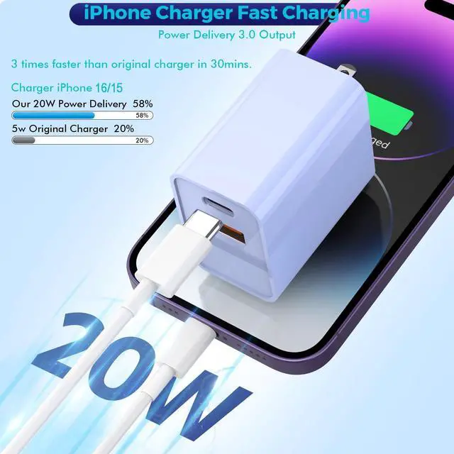 Fast Charger: T? he usb c wall charger block dual-port design with the ability to use USB-C and USB-A ports simultaneously. The dual port wall charger delivers up to 20W of power via the USB-C port,? allowing charge your iPhone 16e/15 up to 3X faster than standard 5W charger, greatly saves your time and improves efficiency