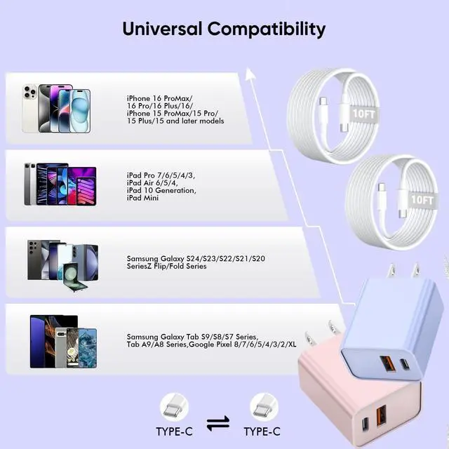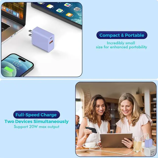 What You Get: 2 pack 20W Dual-Port Chargers(Pink/Purple), 2-pack 3M USB-C to USB-C cables. Eextremely compact size and travel-friendly design fits into your pocket or bag easily without occupying too much space