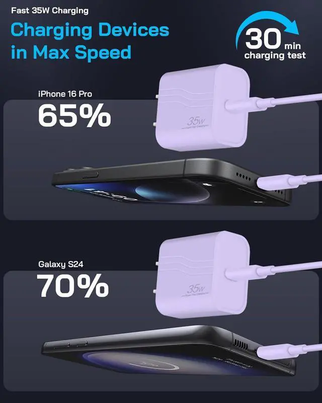 35W i Phone 16 Fast Charger Experience Super Fast Charging with our powerful USB C Charger. Charge your i Phone 17 16 Pro up to 65% or your Galaxy S24 up to 70% in just 30 minutes. This i Phone Charger Fast Charger is your perfect solution for rapid, on-the-go power, ensuring your devices are ready when you are.