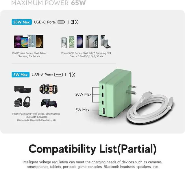 Great space-saving charger: You dont have to worry about juggling multiple chargers anymore. The USB-C port and the USB-A port are very handy. The USB-C ports provide up to 45W for iPhones, iPads, air pods, Samsung Galaxy S25/S24/S23/Ultra, Android Phones, students Chromebooks, tablets, smartphones, hand bands, gaming consoles, controllers, projectors, baby video monitors, Smart watch, Speakers, earbuds, headphones, Kindles, iWatches, Switches, bedside lamps, reading lamp and other USB-C charging devices. The USB-A port is great for cell phones or other smaller devices.
