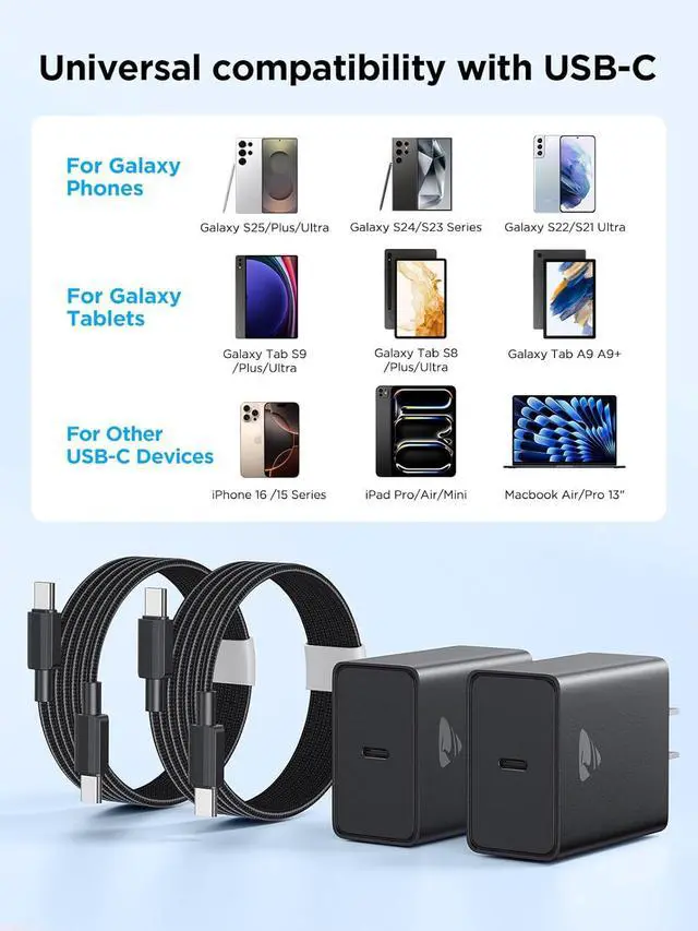6.6 ft Extra Long Type C to Type C CableThe fast charger USB C android for the Samsung Galaxy S25/S24 Ultra come with two 60W USB C to C cable cords. The 6.6FT extra-long cable allows you to charge your Samsung S25 Ultra freely in any setting, whether on the couch, in bed, in the backseat of a car, or at the office. The cable is made of sturdy woven nylon material, which is 10 times more durable than ordinary cables and has a longer service life