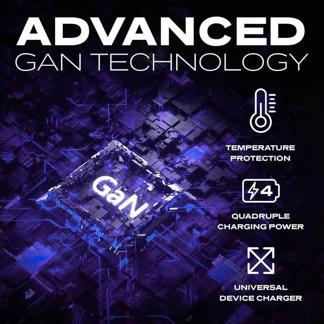 Upgraded GaN TechnologyGaN technology not only reduces the size and weight of chargers, but also generates less heat and reduces power consumption effectively. This greatly improves charging efficiency, making it safer and more convenient to charge your devices.. GaN technology allows us to shrink the charger' s footprint while delivering uncompromised power, making it compact and portable without sacrificing performance