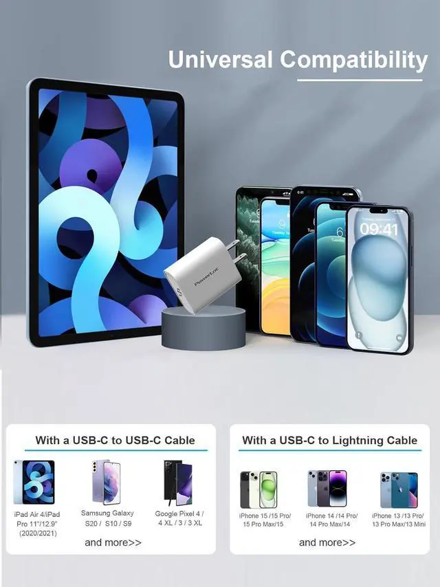 Universal CompatibilityPowerLot 20w USB-C power adapter could work with most devices support PD protocol. Such as iPhone 15 / 15 Plus / 15 Pro / 15 Pro Max / iPhone 14/14 Pro/14 Pro Max/iPhone 13/13 mini/13 Pro/13 Pro Max/iPhone 12/12mini/12 Pro/12 Pro Max/11/11 Pro/11 Pro Max/SE/XS/Max/XR/X, iPad Air 4/5/6, iPad Mini 5th/6th, iPad Pro 11/ 12.92020 /2021AirPods, iWatch 8/7/SE and more