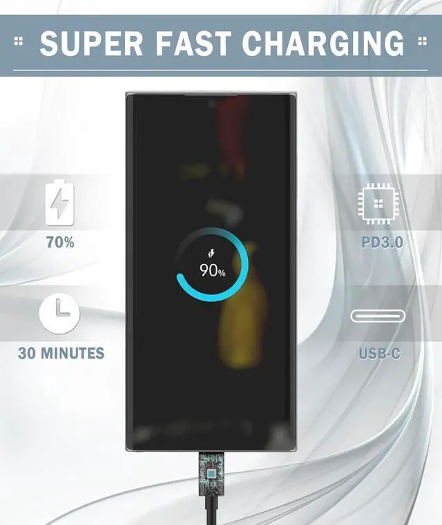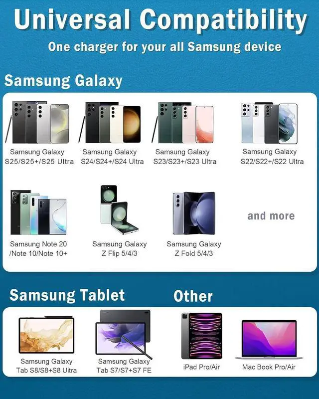 Superior Safety Fast ChargingThe USB C charger cable fast charging block kit comes with a 100W detachable USB C to USB C cable, super charge with max 5A current for your phone from any other USB-C power source such as your phones, tablets, and computers. Use the cable to sync and transfer files at blazing speeds with your Galaxy phones or any other compatible smartphone or laptop