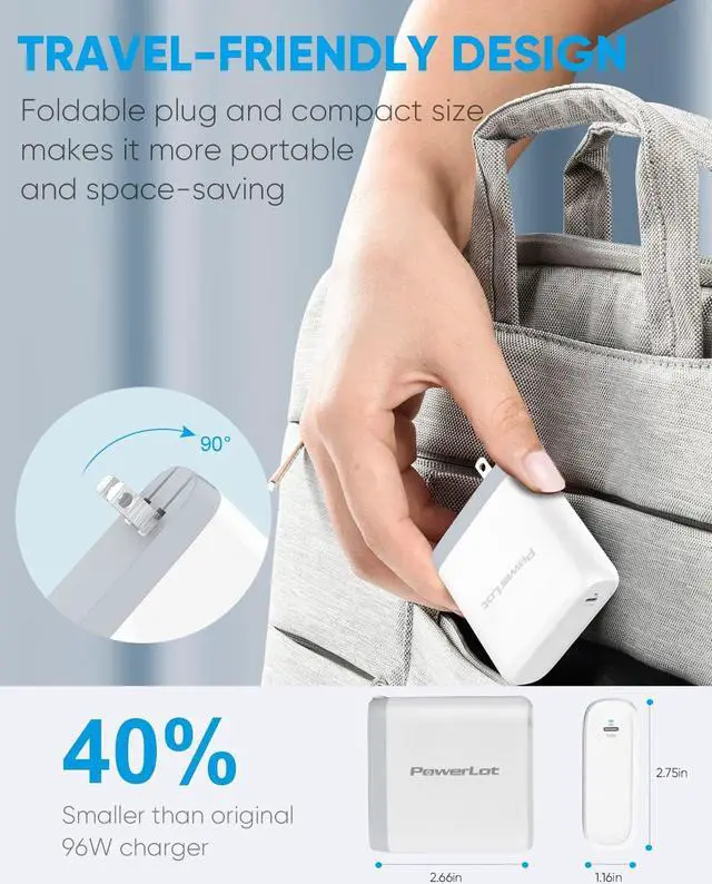 Smaller & PortableGaN tech makes this usb c power brick 40% smaller than standard MacBook Pro 16' ' charger while provide a faster power output. Feel assured to bring this compact cell phone charger with foldable pins on any trip. Just put into your bag or pocket and start your journey