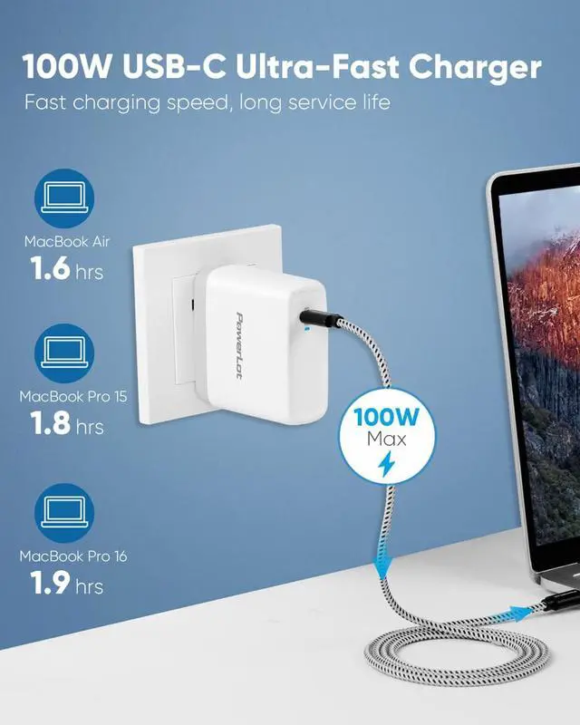 Quality Products and ServicesPowerLot 100W usb c power adapter x1, 1.8 m Type-C to Type-C cable x1, 24-month product replacement warranty and lifetime friendly technical support