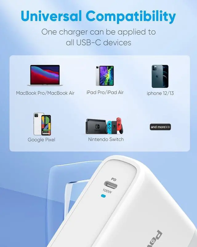 Universal CompatibilityOur 100W PD charger is a good choice for most devices with usb c port, such as MacBook Pro/Air, iPad Pro/Air, Lenovo ThinkPad, ASUS ZenBook, Acer Chromebook, Dell Latitude, HP Spectre, Microsoft Surface Pro; iPhone 14/14 Pro/14 Pro Max/14 Plus/iPhone 13 Pro Max/13 Mini/12 Pro Max/12 mini, Google Pixel 6/6 Pro and more