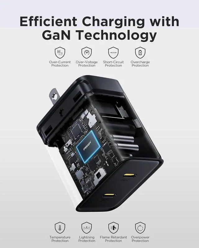 [PMEl Micro-Space Efficient Integration & PSFC PISEN Safety Fast Charging Technology]: Optimized GaN volume structure and PISEN' s self-developed safety charging technology. Powered by the next-generation GaN chip technology, this charger ensures a lower surface temperature and faster heat dissipation, resulting in an ultra-efficient and safe charging experience.