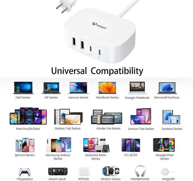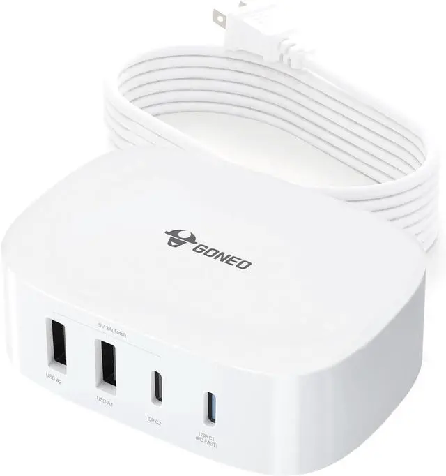 All-in-One 4-Port Charger: Features 2 USB-C and 2 USB-A ports, allowing you to charge phones, tablets, smartwatches, and earbuds simultaneously. Perfect for reducing cable clutter at homeno need for additional adapters or multiple wall outlets.