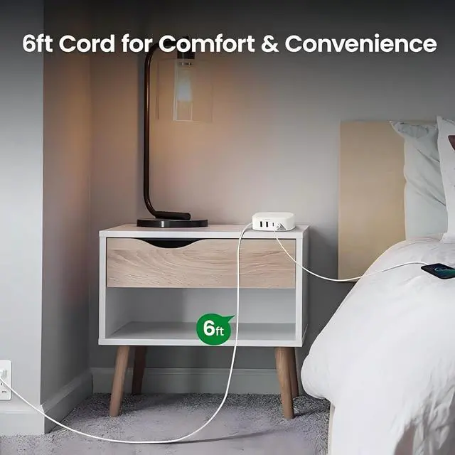 Extended Reach for Comfortable Use: Comes with a 6ft ( 1.8 m) extension cord, giving you the flexibility to place the charger on desks, nightstands, or near sofasno more struggling with short cords or hard-to-reach outlets.