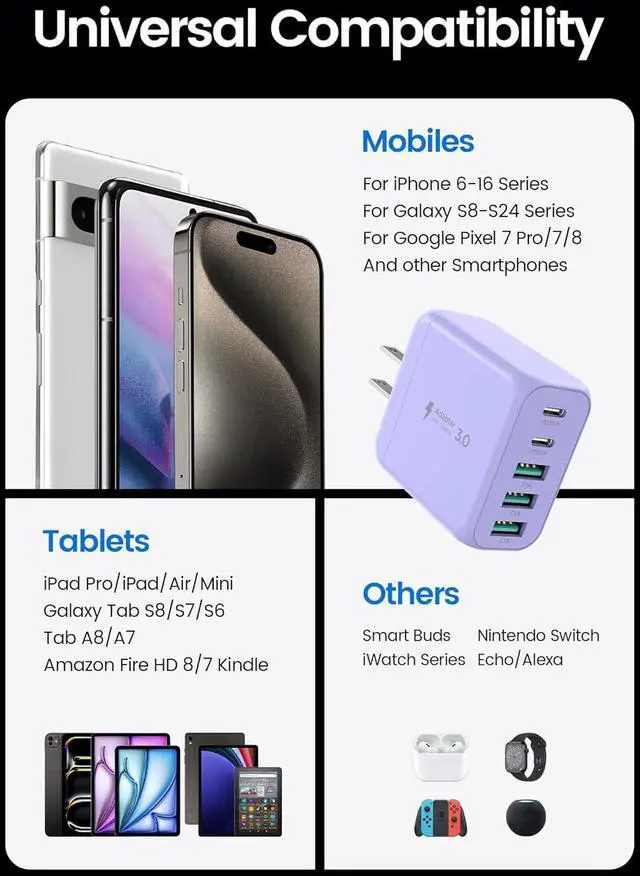 Works with All Devices: Thanks to its special 5-port design, this USB-C charger plug is compatible with nearly all electronic devices. It works with iPhone models from 7 to the latest iPhone 16, various iPad models, Samsung Galaxy phones including the S24 and Note series, as well as LG, Motorola, Google Pixel, Apple Watch, AirPods, Samsung Watch, Galaxy Buds and many other digital devices.