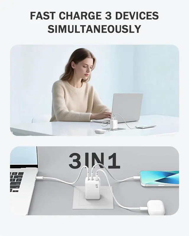 Fast Charging for 3 Devices: Equipped with two USB-C ports and one USB-A port to power three devices simultaneously, connect a single device to charge up to 67W.