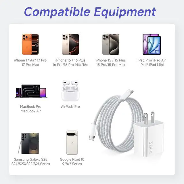 COMPATIBILITY: for iPhone Air/iPhone 17 Pro Max/17 Pro/17/iPhone 16/16plus/16pro/16promax/iPhone 15/15plus/15pro/15promax, iPad pro 2018/2020/2021/2022/2023/2024, iPad Air 4/5/6/7, for Samsung S25/S24/S23/S22/S21, for Google Pixel 10/9/8/7, and all USB-C devices