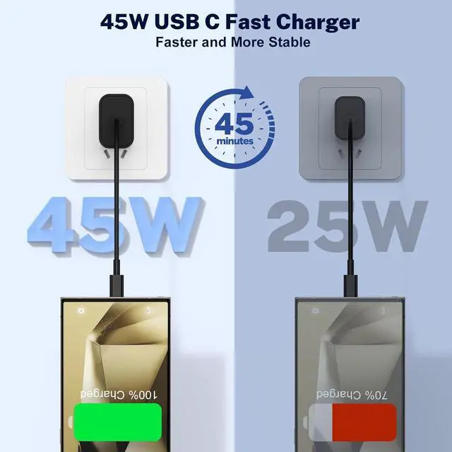 45W Samsung Super Fast ChargerThe Type C fast charging block with a 6.6 ft+10ft long Type C to Type C fast charge cable, super fast charger USB C Samsung combo kit provides maximum 45W output power and super fast charge for Samsung Galaxy S25 Ultra/S24/S23 Ultra from 0% to 60% in just 30 min, 3 times faster than the original 5W charger.