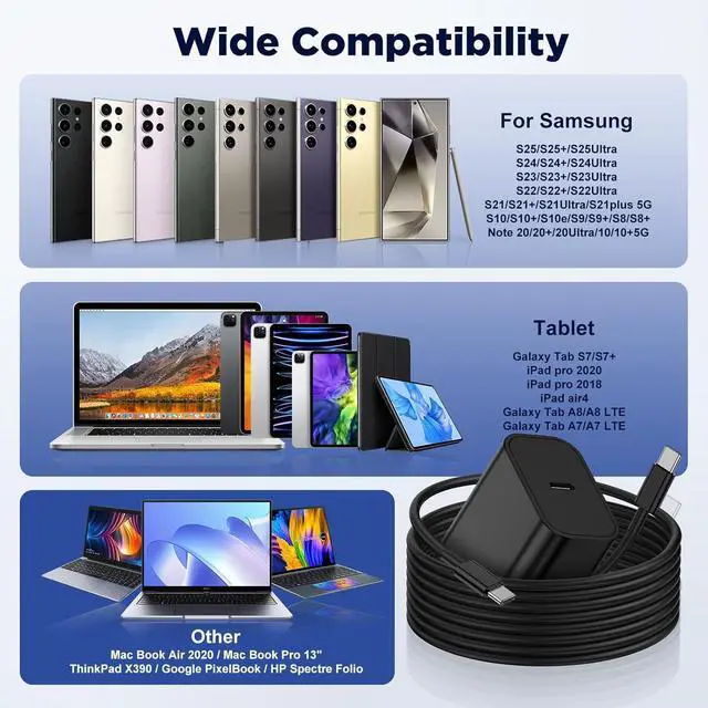 Wide CompatibilityThe Samsung 45W USB C charger fast charging wall charger with virtually all USB-C devices, especially for Samsung Galaxy S25 Ultra/S25/S25+/S24 Ultra/S24/S24+/S23 Ultra/S23/S23+/S22 Ultra S22+/S22 Ultra/S22, S21 Ultra/S21+/S21 Ultra 5G/S21, Note10/ 10+, Note 20/20 Ultra 5G, Galaxy Z Fold 5/Galaxy Z Flip 5/Galaxy Z Fold 3/Galaxy Z Flip 3, Google Pixel xl, 2/2xl, 3/3xl, 4/4xl, 5/5xl, 6/6 Pro, 3a/3a xl, Pixel 4a, Pixel C Tab, Google Chromebook Pixel.