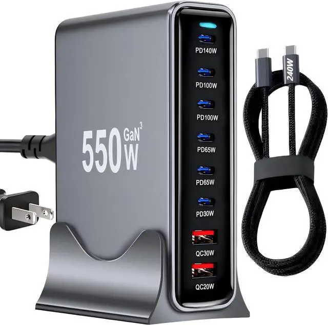 Upgraded PD 140WOur 550W multiple usb c charger station offers 1×PD 3.1 140W, 2×PD 100W, 2×PD 65W, 1×PD 30W, and 1×QC 30W, 1×QC 20W ports for laptops, tablets or phones with iOS or android system. The 140W PD 3.1 port of the charger station charges a MacBook Pro 16" fully in 1.5 hours and an iPhone 16 Pro to 65% in 30 minutes20%-30% faster than other iPhone charging station and charging blocks.