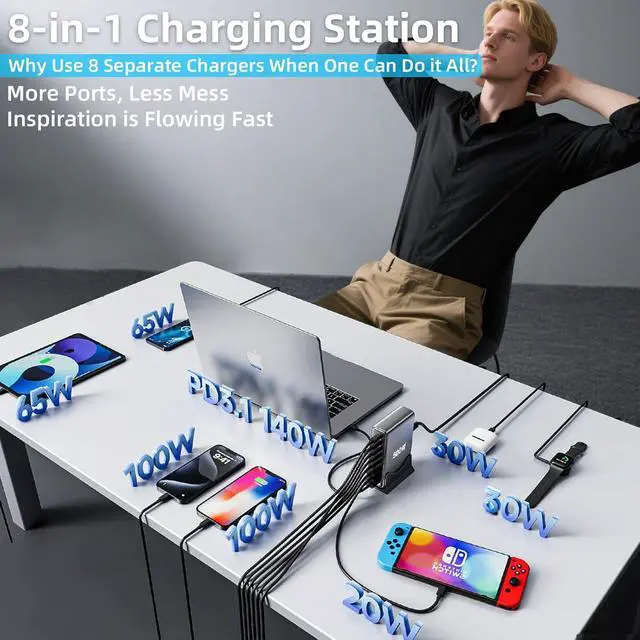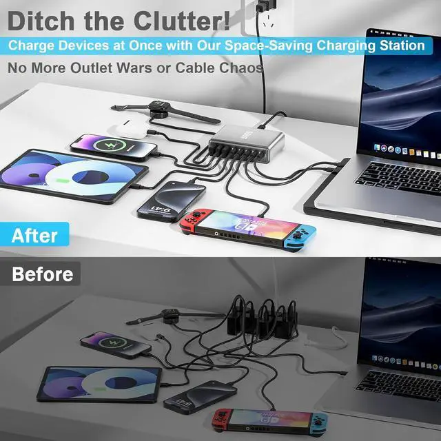 Compatible with almost any deviceOur 550W multi charging station serves as chargers for multiple devices, supporting fast charging for MacBook Pro/AIr, iPhone, Samsung Galaxy, iPad, Dell XPS, Google Pixel, Apple Watch, and almost all generations of electronics, acting as multi chargers for all devices.