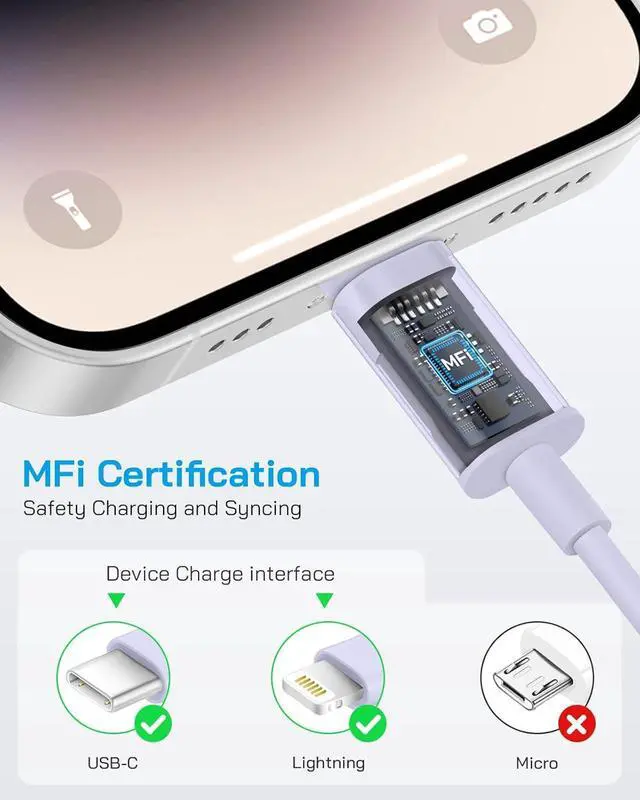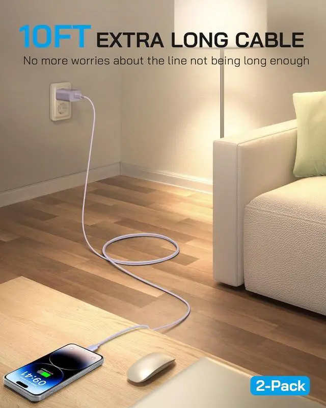 Extra-Long 10ft Phone Charger Fast Charging Cable: Enjoy unmatched flexibility with the 10ft Lightning cablecharge comfortably from bed, couch, or backseat without being tethered to an outlet.