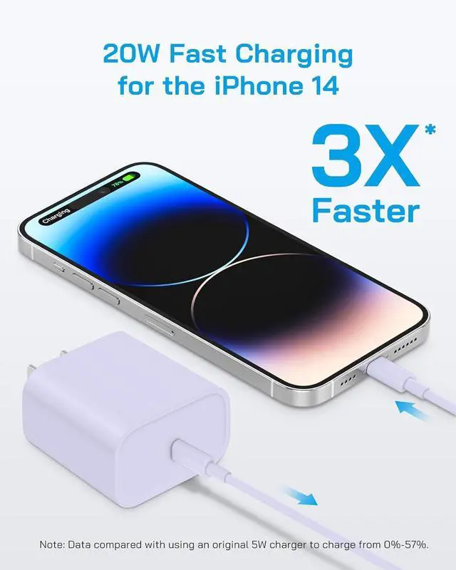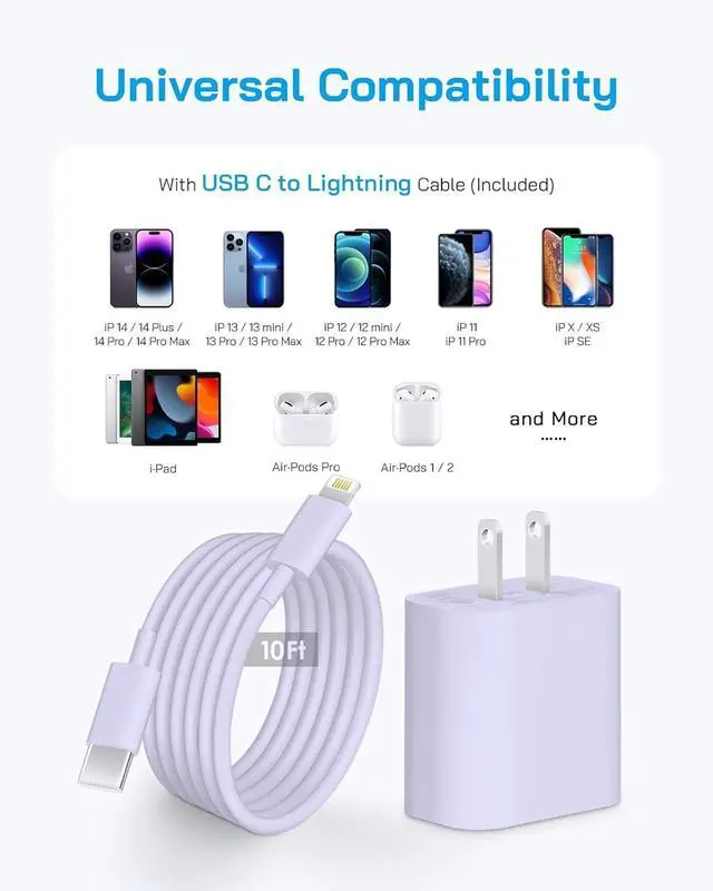 Phone Fast Charging 20W: Equipped with PD 3.0 technology, this 20W USB-C wall charger delivers rapid charging for Phone 14/13/12/11/X/8 and AirPods, reaching 3X Fast Charger than the 5W Wall Charger. Compatible with all Lightning devices!