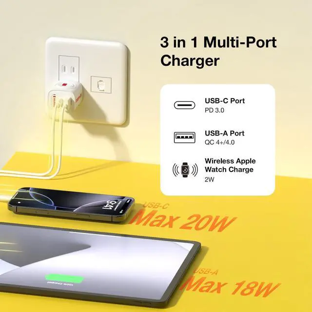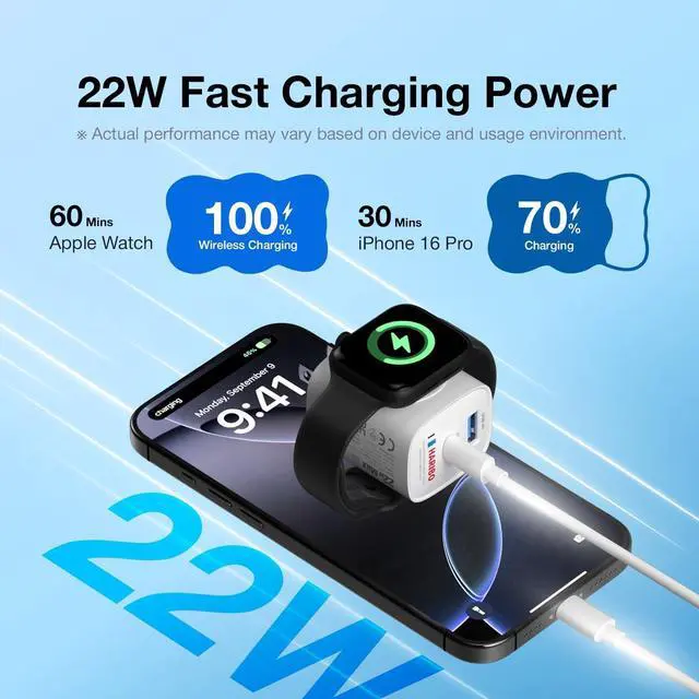 [Simultaneous Charging] 3-in-1 design charges smartphone, Apple Watch (wireless), and another USB device at the same time (power is distributed/limited when used at the same time)