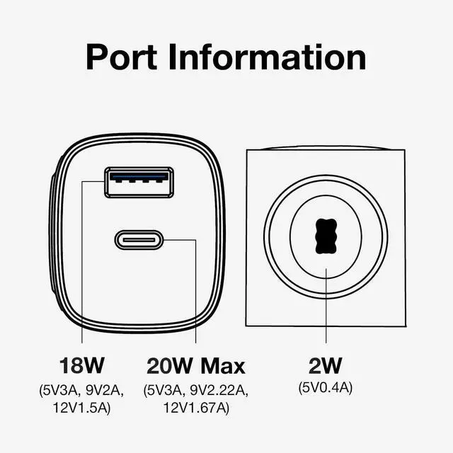 [Port Information] Input plug: 110~240V, 50/60Hz 0.6A, USB-C: 20W max (5V 3A, 9V 2.22A, 12V 1.67A ), USB-A: 18W max (5V 3A, 9V 2A, 12V 1.5A ), Wireless: 2W max (5V 0.4A )