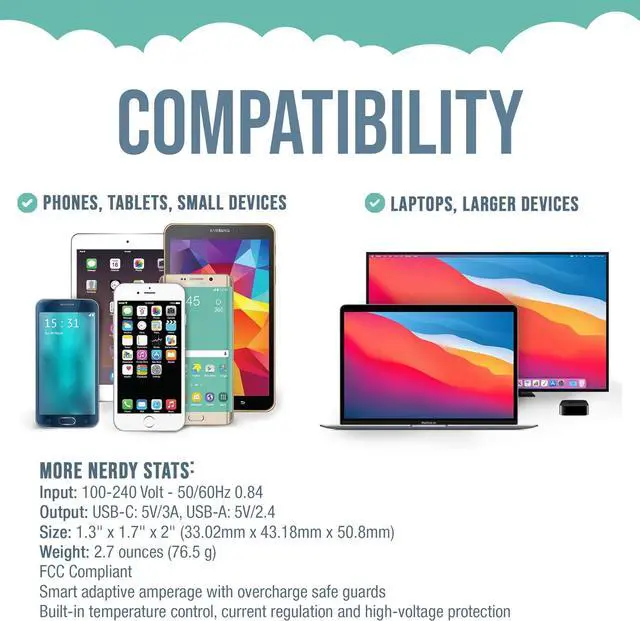 Weight: 2.7 ounces; UL/FCC Compliant; Smart adaptive amperage with overcharge safeguards