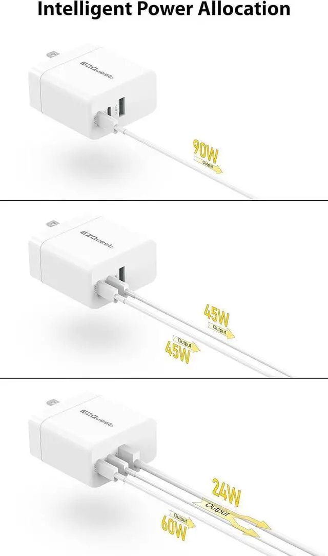 [CHARGE EVERYTHING] This USB C fast charger 90W is capable of charging a single MacBook Pro 16-inch at 90 Watts or two at 60/30 Watts each simultaneously. You can also charge your iPad at 18 Watts when it is charged by itself. This charger supports QC4+, PD 3.0, QC 3.0, QC 2.0, PPS, AFC, Apple 2.4A, FCP, and SCP charging protocols.
