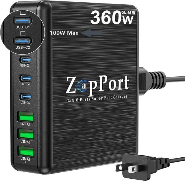 Advanced GaN Technology for Superior EfficiencyUtilizing the latest GaN technology, our charger station hub delivers higher efficiency, reduced heat generation, and a more compact design compared to traditional chargers. With a total power output of 360W, it ensures fast and reliable charging for a wide range of devices.