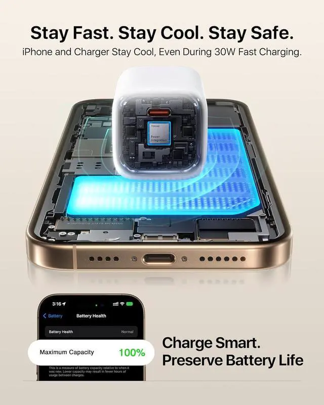 ..: Powered by a Torras smart chip and dynamic cooling tech, this 30W USB-C charger keeps both your iPhone and the charger cooleven during fast charging. Smart power regulation protects your phone' s battery health, helping maintain 100% battery capacity for longer. Charge smarter, stay safer.