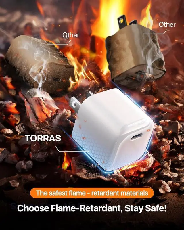 -.: Crafted with top-tier V-0 flame-retardant materials, the TORRAS charger resists extreme heat and prevents melting or deformation. Unlike ordinary chargers, it maintains structural integrity even under high temperaturesgiving you peace of mind every time you plug in.