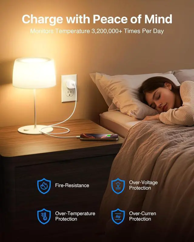 : With 3.2 million+ temperature checks daily, this USB C charger offers round-the-clock protection. Fire-resistant casing and built-in safeguards against over-voltage, over-current, and overheating ensure safe overnight chargingso you can rest easy.