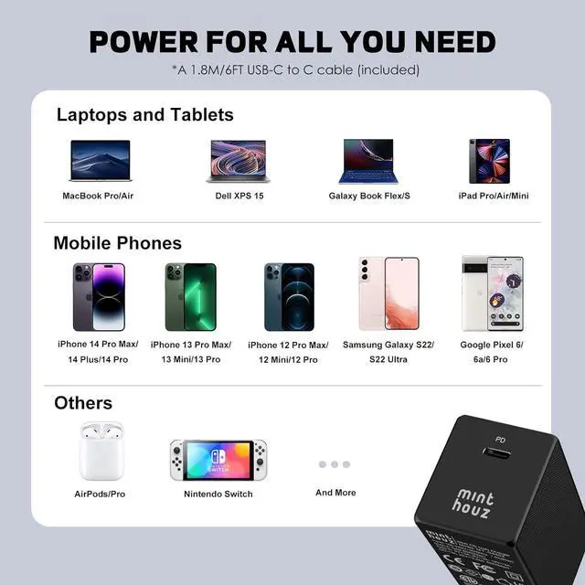 Universal Compatibility: Minthouz 65W GaN II USB C Charger Plug is compatible with lots of devices like Macbook Air/Pro, Galaxy Book Flex/S, Dell XPS 15, iPad Air/Mini/Pro, HP Specter x360/ Envy/ Elite, Dell XPS, Lenovo ThinkPad X1 Carbon, Huawei MateBook, Google Pixelbook, Chromebook Pixel, iPhone 14/14 Pro/14 Pro Max/14 Plus/13/12/11, Samsung Galaxy S22/S22 Ultra/S21/S20, Huawei P50, Google Pixel 6/6a/6 Pro, AirPods/Pro, Nintendo Switch, etc.