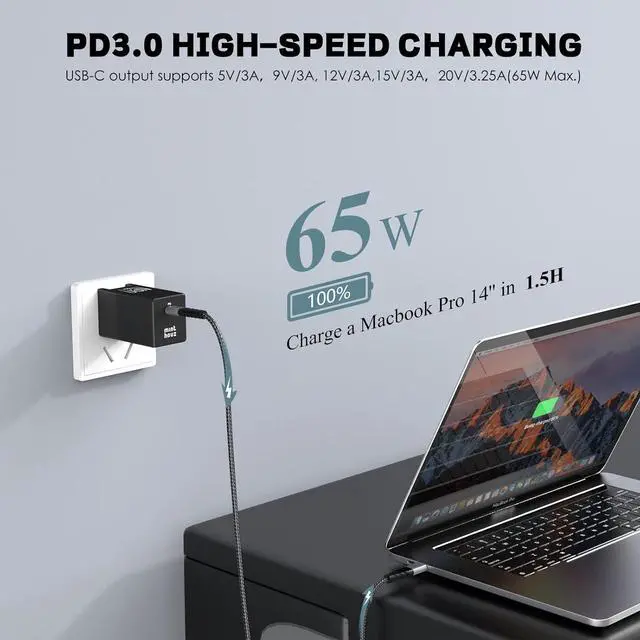 USB C Fast Charger Plug: With 6FT USB C to C Fast Charging Cable (included), Minthouz charger plug can charge a Macbook Pro 14 within 1.5H, give you a true 65W fast charging experience.